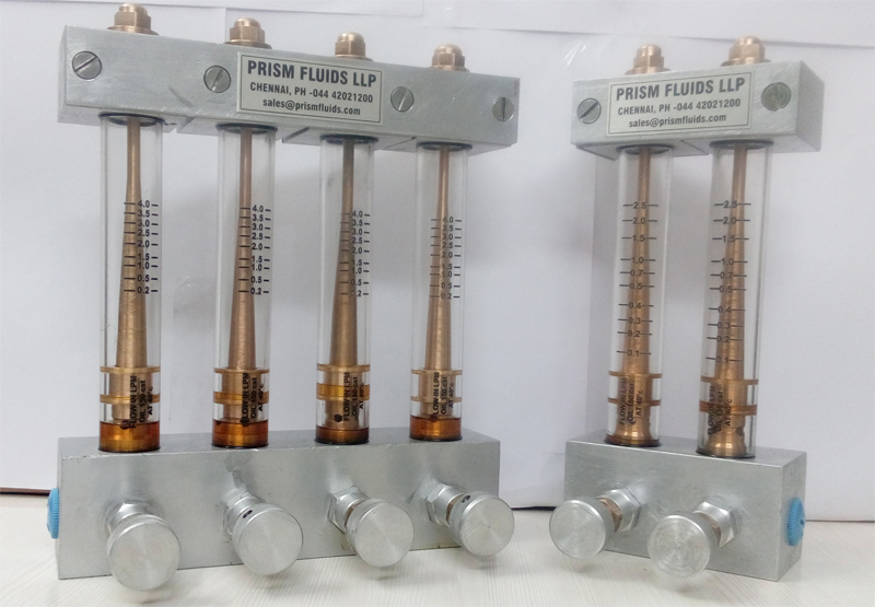 Prism’s flow monitors are compact, & reliable developed to precisely control & monitor the oil flow to the paper machine bearings. They work on the variable area principle, where a metallic float raises inside a variable area tube and the flow rate can be read off the adjacent scale. The amount of oil flow is adjusted by means of a built-in needle valve. We offer these Oil Flow Monitors in the range of 0.1 to 1.1 LPM ,0.3 to 3 LPM& 0.3 to 7LPM. These are available in 2, 4, 6 or 8 outlet configurations, with or without switches and are available in fully acrylic or acrylic – metal materials.